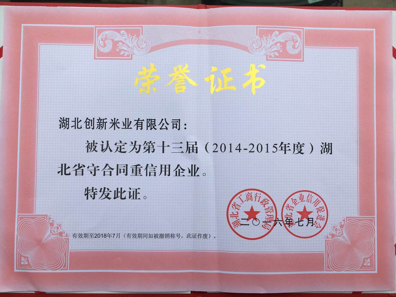守合同重信用企業榮譽證書